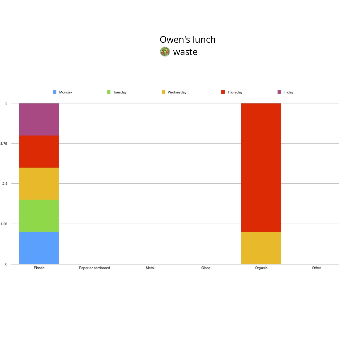 For this task, students predicted what type of waste would appear most frequently, collected data on their food waste which they used to create a graph, and then looked at this data to make conclusions about what waste they are creating and how they can minimise their waste. This project took place over approximately four lessons.