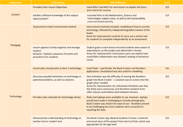 I chose a reflection tool that could be used to reflect on a singular lesson or short series of lessons. I had looked at the rubric developed by Koh (2013), but found that this rubric, while detailed, would be better suited to reflecting upon a long-term technologies program. I decided to use the TPACK Rubric developed by Akcaoglu, Kereluik and Casperson (2011) and have included the rubric below.