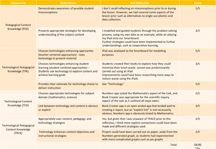 It could be interesting to use the TPCK model/rubric throughout a whole topic area assessing the perspectives of students. This could look like taking regular observation notes of the conversations occurring between students during their learning and engagement in a design task using a technology such as the iPad apps for designing graphs and reflecting on their wastes. The conversations between students could be categoried as T, P, C, a combination of the two or TPC together. The details of an approach like this was noted in (MISHRA & KOEHLER, 2006) who found that over time those working in these groups on a design based activity had an increase in frequency of conversations that hit on all three aspects (TPC) as they performed authentic tasks with technology.